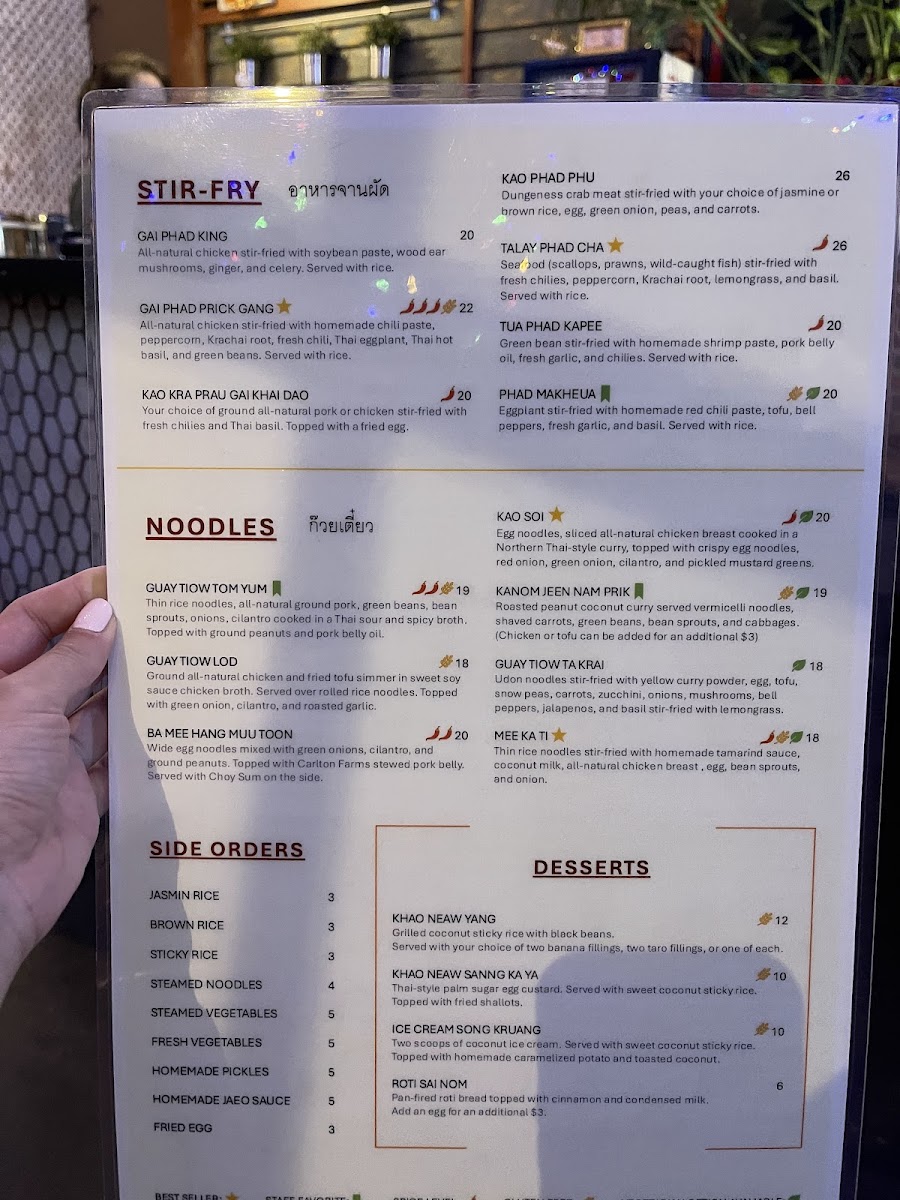 The menu offers a variety of savory, spicy, and sweet flavors representative of regional Thai cooking. It suits casual dining occasions and is structured to accommodate both quick orders and full meals. Beverage options, including Thai Tea and Thai Iced Coffee, are also featured, complementing the food selections.