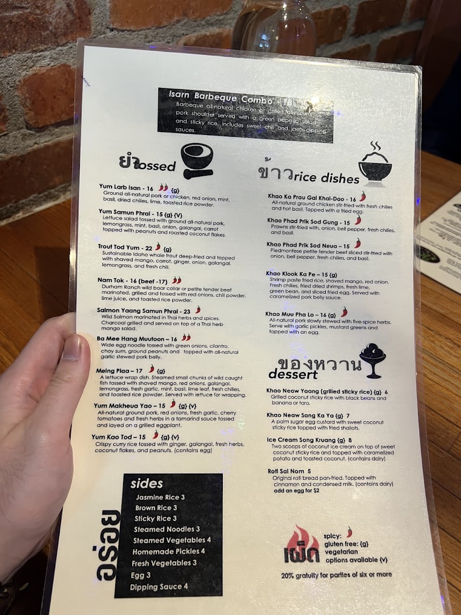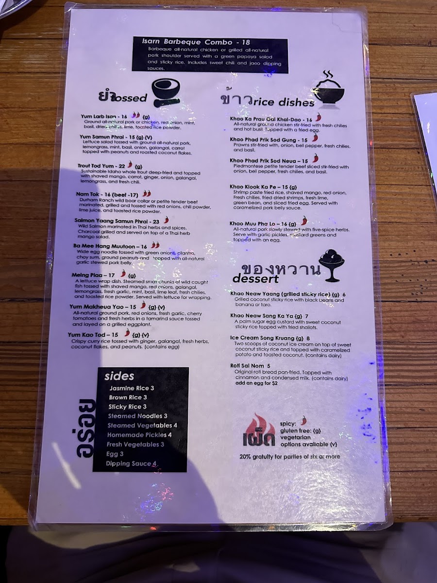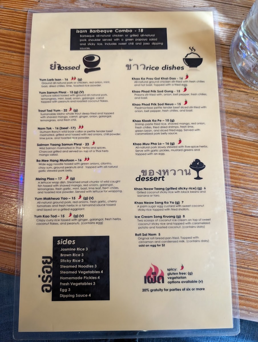 The menu features a range of authentic Thai dishes with a focus on Northern and Northeastern (Isan) Thai cuisine, including many vegan options. It is organized into several groups designed to cater to varying dining preferences throughout the day.
